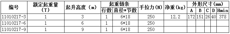 起重量1噸的手拉葫蘆技術(shù)參數(shù):